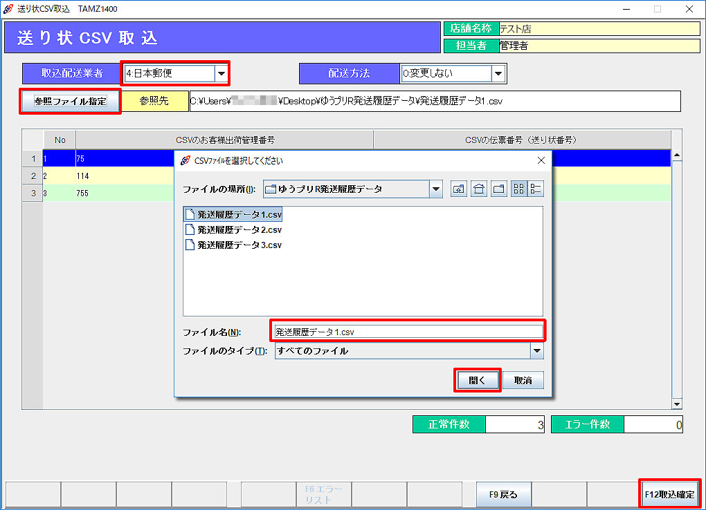 ④ 「参照」ボタンを押して、保存先よりタロスから出力した送り状CSVファイルを選択し、「取込」ボタンを押します。