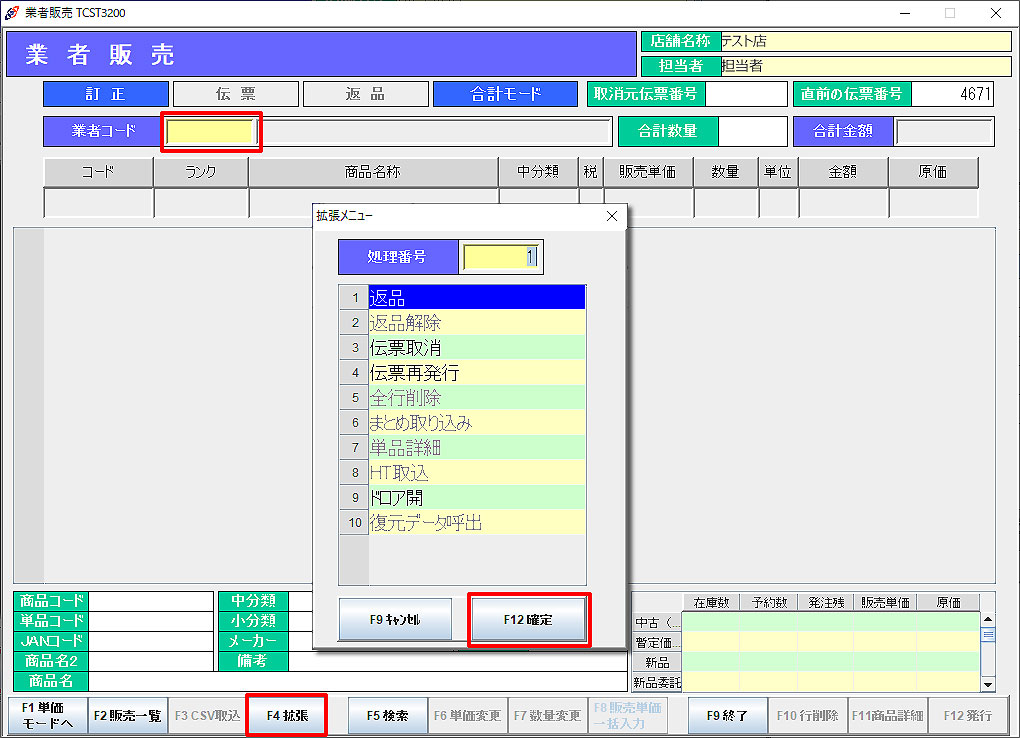 カーソルが業者コード入力欄にある状態で「F4拡張」をクリックします。 拡張メニューの中から行いたい処理を選択し、「F12確定」をクリックします。