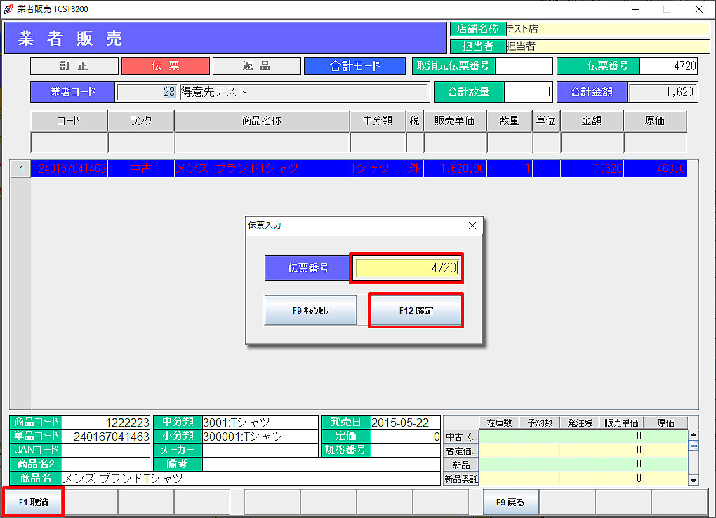※ 伝票番号が分からない場合は、「F2販売一覧」より検索が行えます。