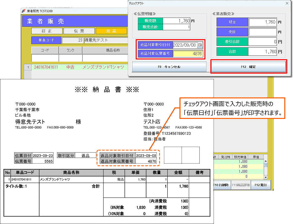 「店舗基本マスタ(基本2)>インボイス利用フラグ」が「1:利用する」に設定されている場合は、 販売返品チェックアウト画面に「返品対象取引日付」と「返品対象伝票番号」入力欄が表示されます。 販売時の伝票番号と伝票日付を入力し「F12確定」をクリックします。