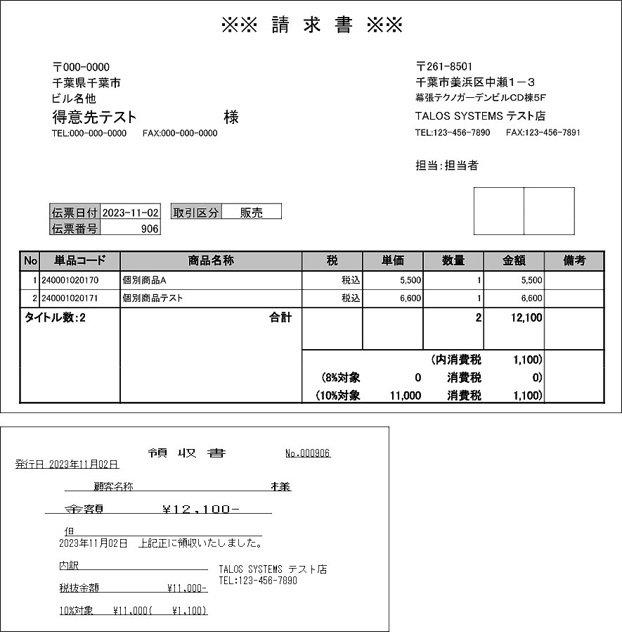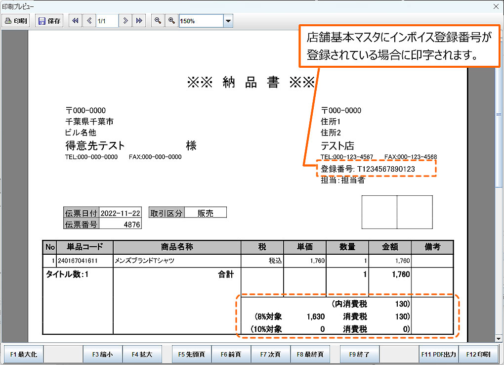 「店舗基本マスタ(基本2)>インボイス利用フラグ」が「1:利用する」に設定されている場合は「インボイス登録番号」が印字されます。
