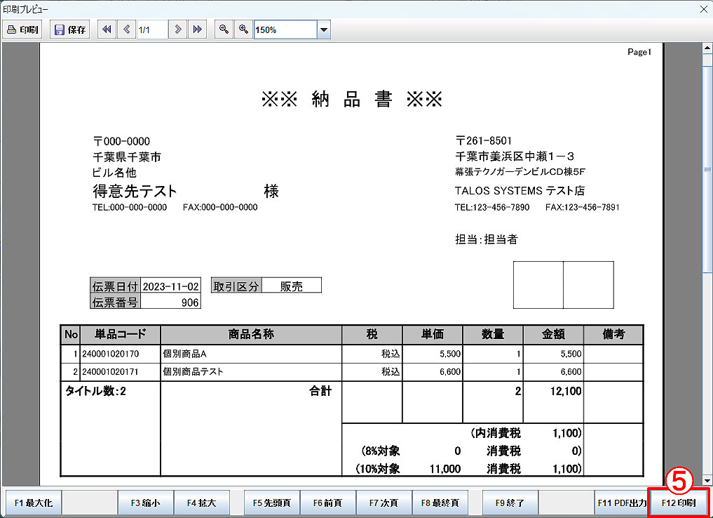 ※ インボイス用書類であるため、税率ごとに区分した消費税額を印字します。 「店舗基本マスタ(基本2)>軽減税率利用フラグ」が「利用しない」の場合でも税内訳を印字します。