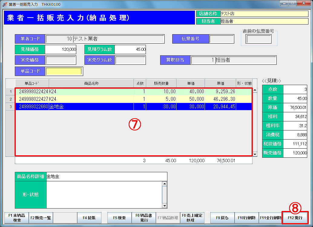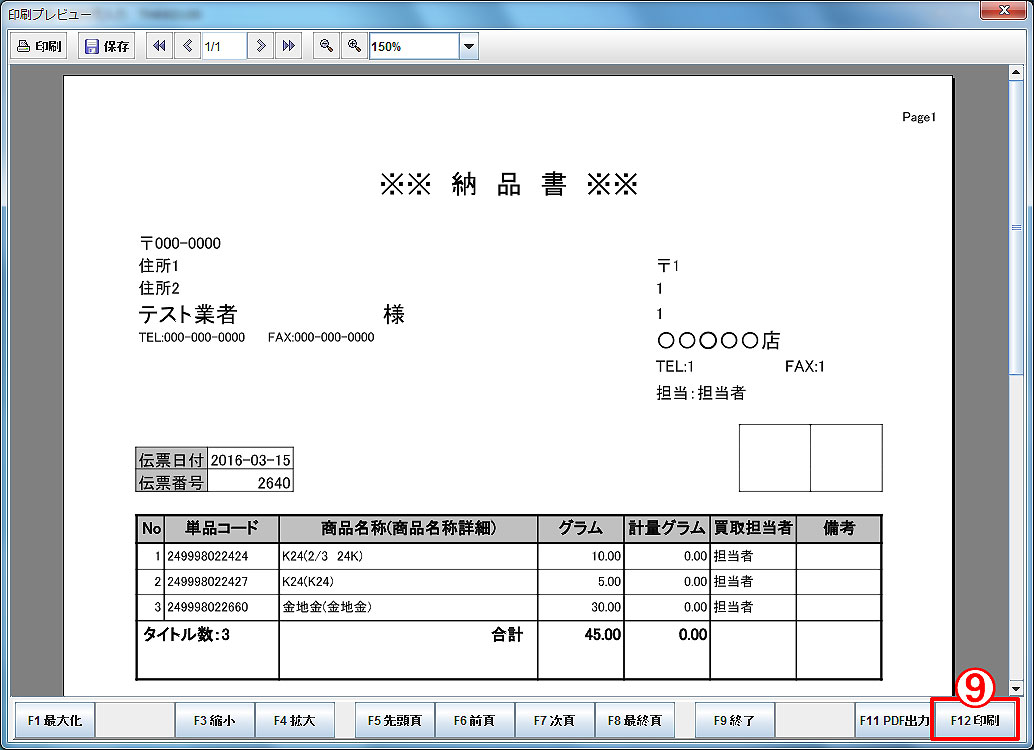 「F12印刷(⑨)」で納品書を発行します。