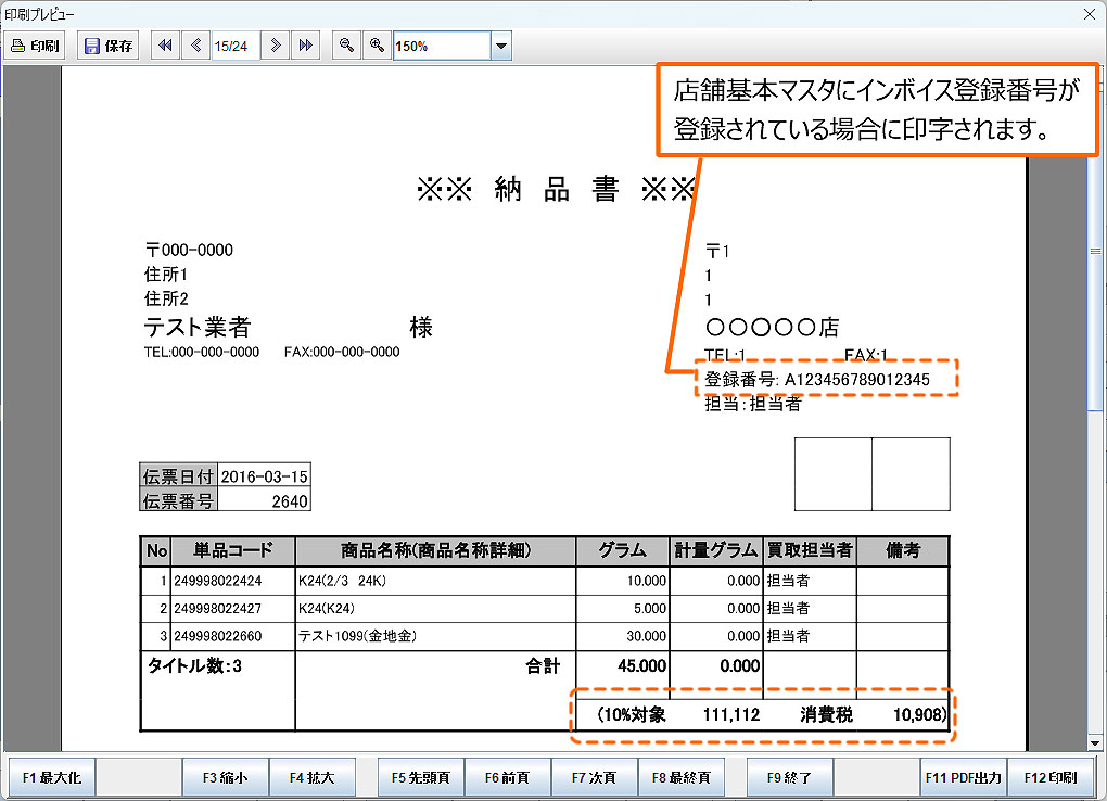 「店舗基本マスタ(基本2)>インボイス利用フラグ」が「1:利用する」に設定されている場合は「インボイス登録番号」が印字されます。