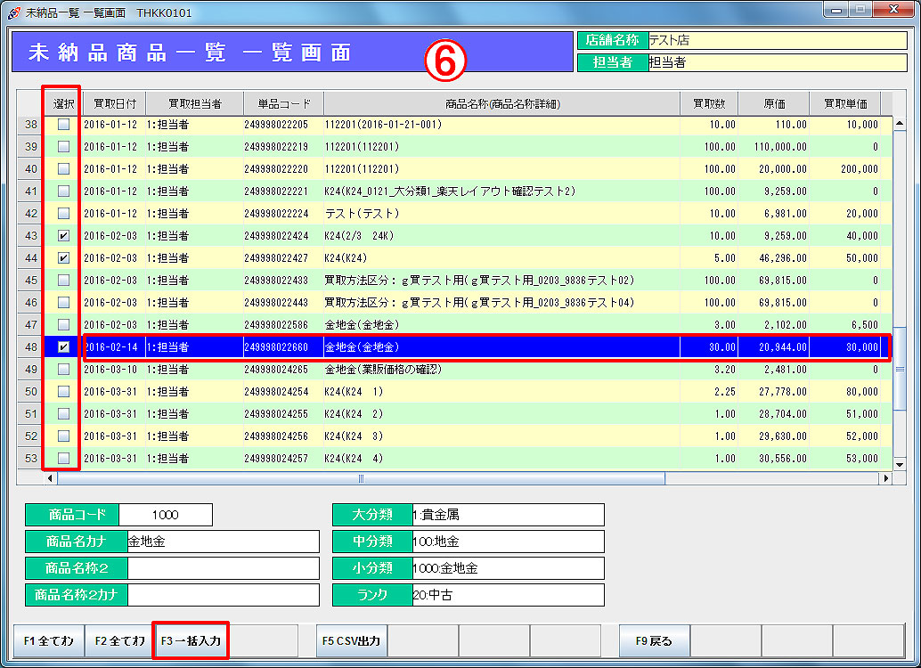 一覧の中から納品対象商品を選択し、選択行をダブルクリック、または選択チェックボックスにチェックを入れ、「F3一括入力」をクリックします。