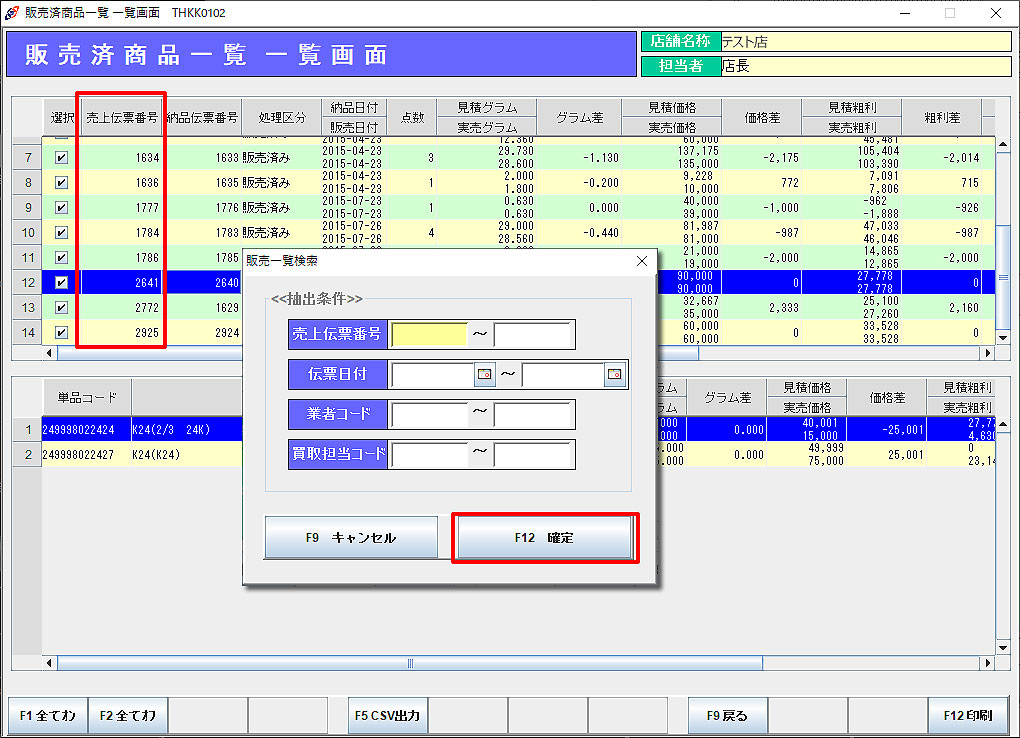 ※ 伝票番号が分からない場合は、「F2販売一覧」クリックで表示される販売済み一覧から確認できます。