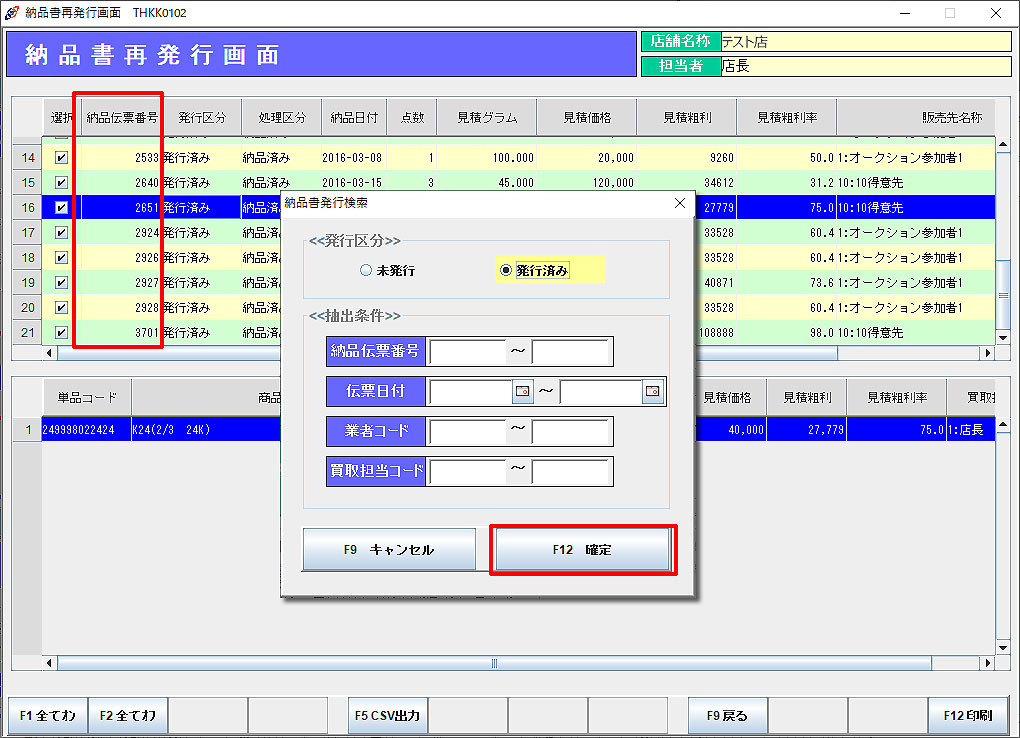 ※ 伝票番号が分からない場合は、「F6納品書発行」クリックで表示される納品済み一覧から確認できます。 また「F8売上確定処理」→「F1納品済み一覧」からも確認できます。