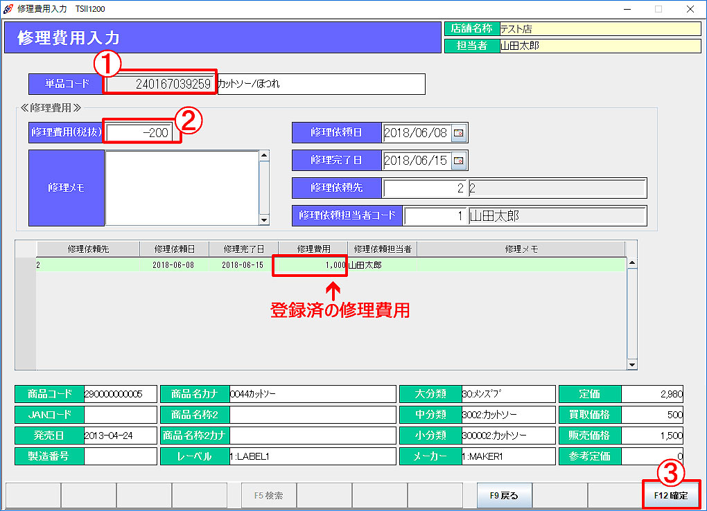 ※ 訂正処理は、修理費用の登録後日次更新をかけてから行ってください。