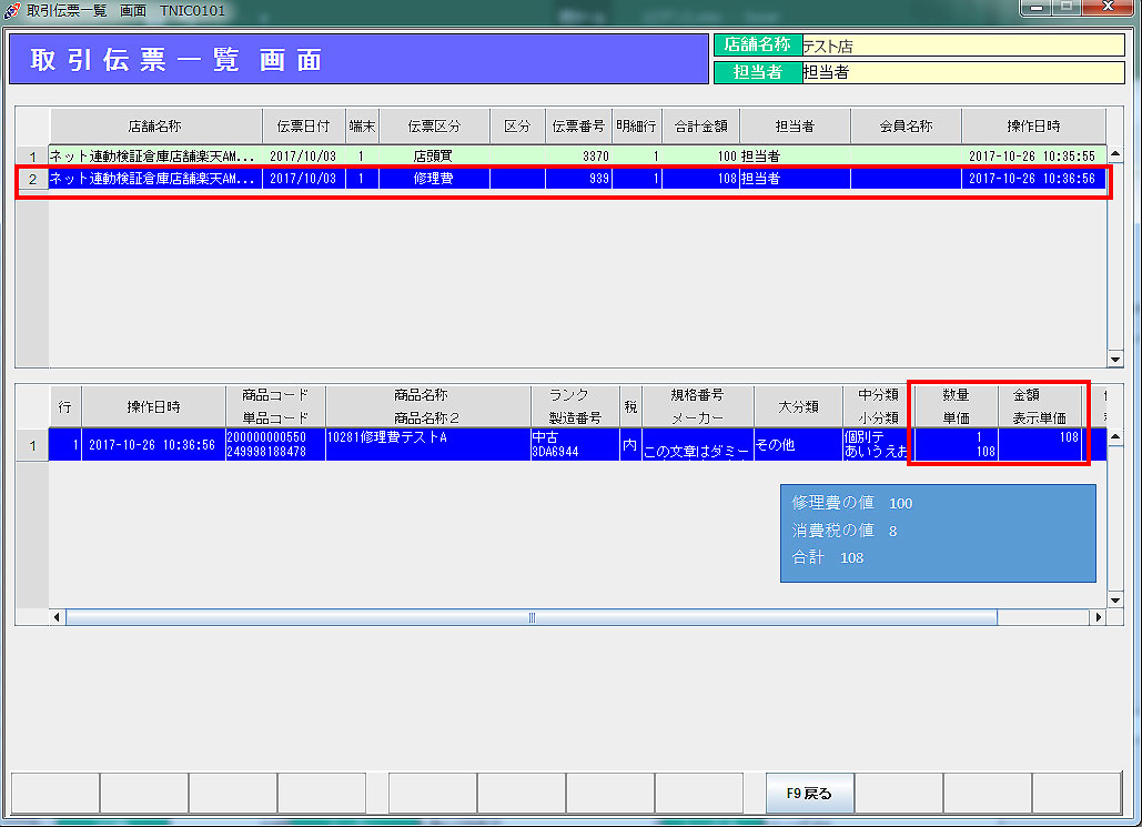 取引明細の「金額表示単価」に登録した修理費用が税込みで表示されます。