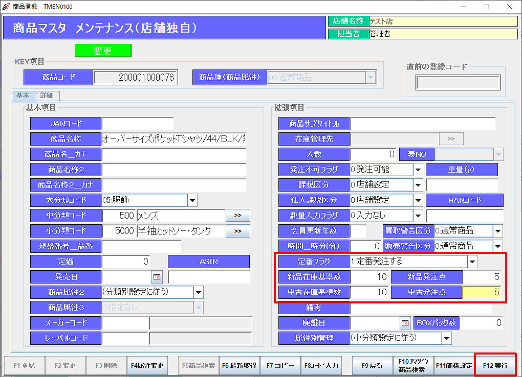 商品マスタの「定番フラグ」に「1:定番発注する」を選択します。