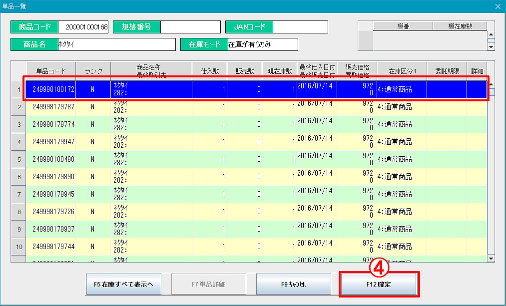 ④ 移動出庫商品に対して複数単品コードが存在する場合は、単品一覧が表示されます。 単品コードを選択し、「F12確定」をクリックします。