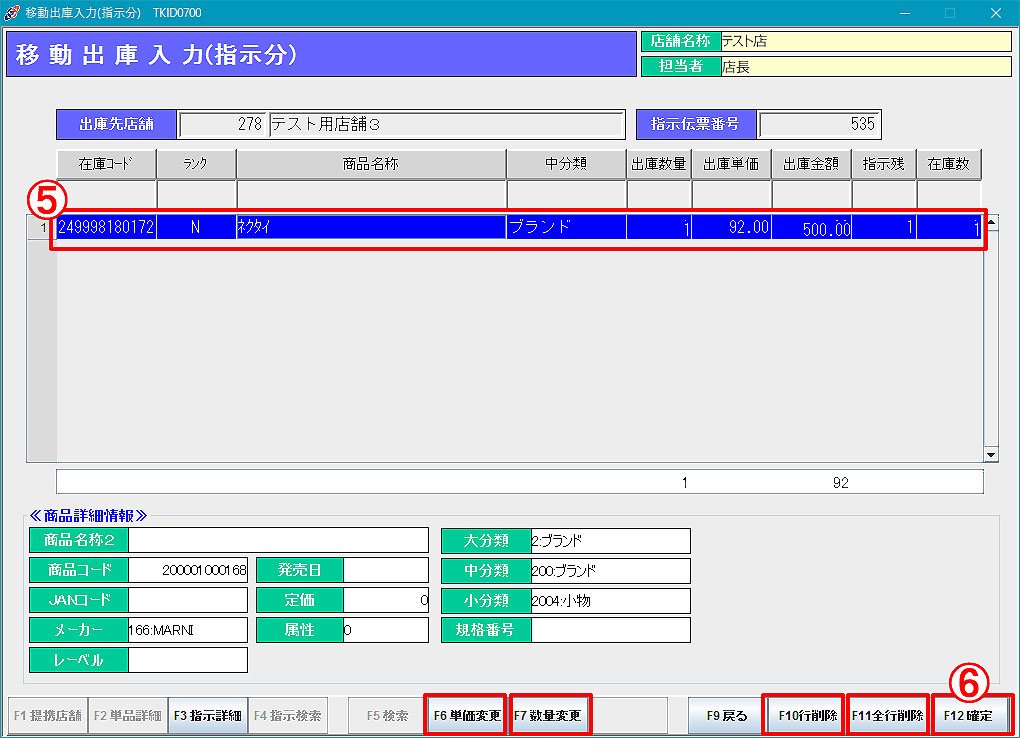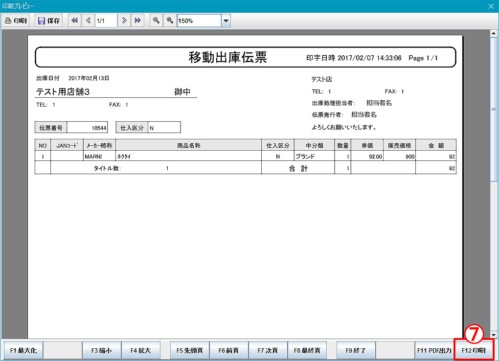 ⑦ 「F12印刷」で移動出庫伝票を印刷します。
