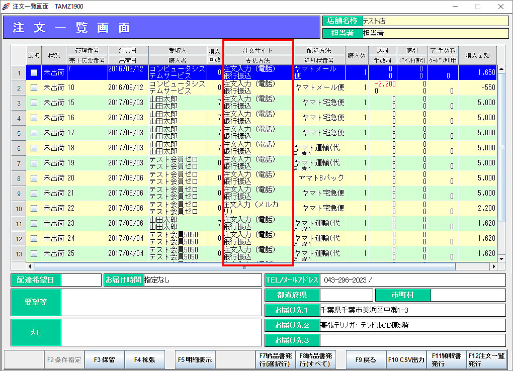 通販入力時に選択した通販区分は、注文一覧の「注文サイト」項目で「注文入力(○○○)」と表示されます。