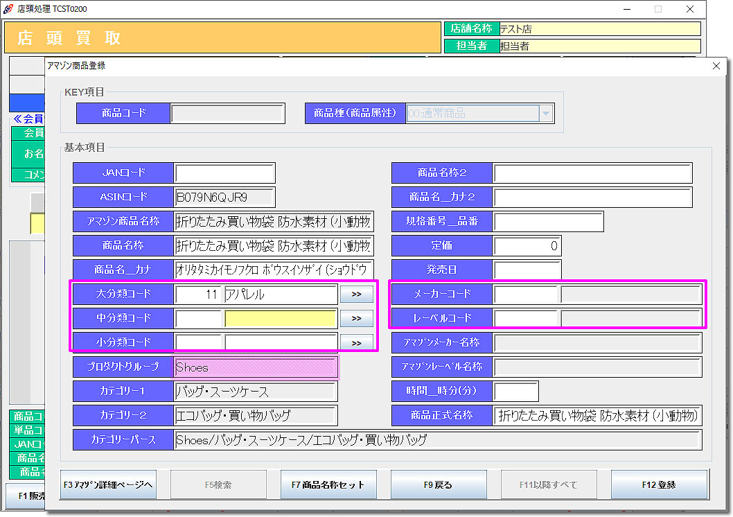 店頭買取時、アマゾン商品登録を行う場合に、アマゾンカテゴリーに対する大中小分類、またメーカーやレーベルを設定すると、紐付けデータが作成されます。 二回目以降に同じアマゾンカテゴリーの商品があった場合は、自動的に大中小分類・メーカー・レーベルが決まります。