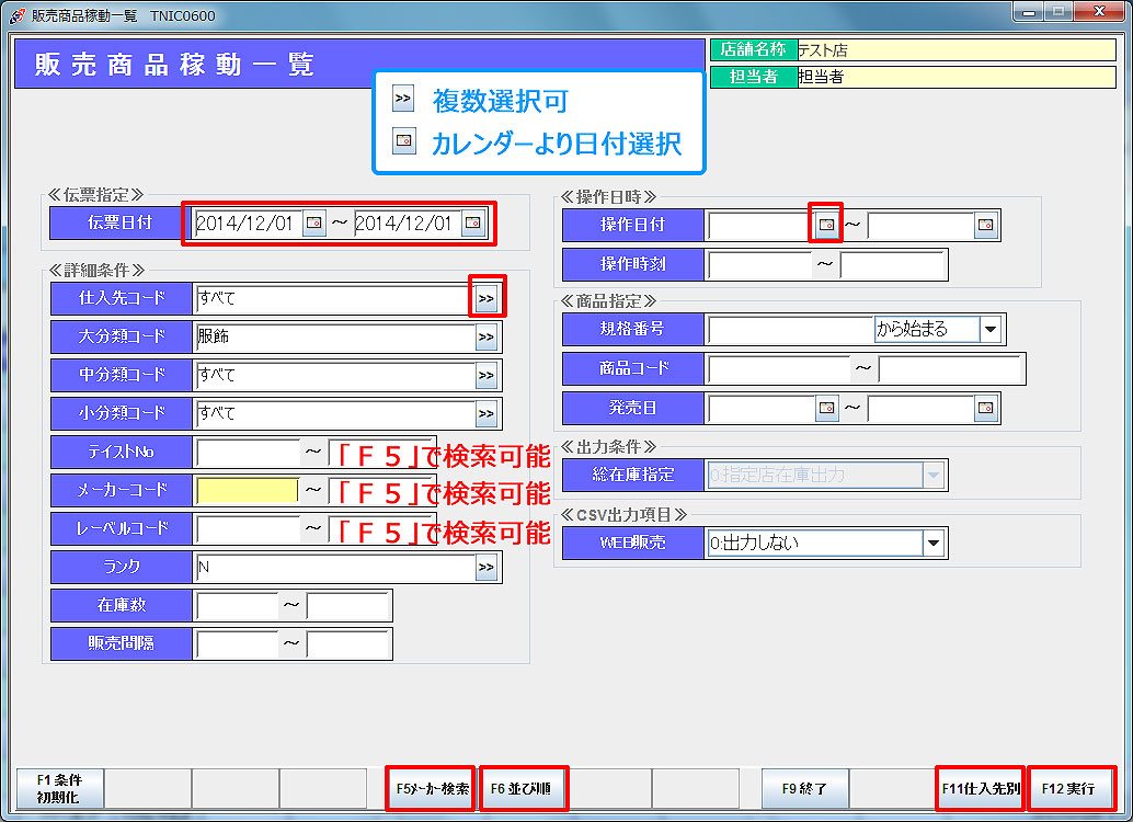 「F12明細印刷」:販売商品稼動一覧を印刷します。