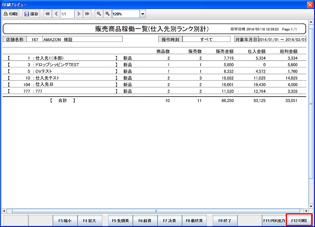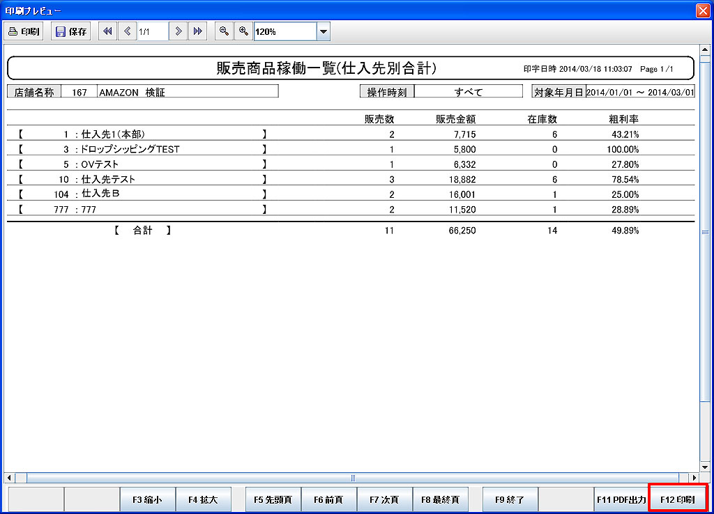 「F11合計印刷」:販売商品稼動一覧(仕入先別合計)を印刷します。