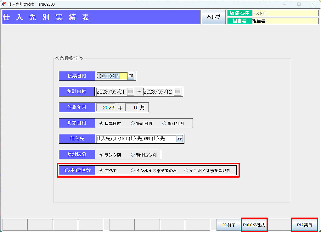 インボイス発行事業者とインボイス発行事業者以外を分けて仕入先別実績表を出力できます。