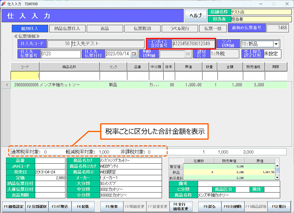 仕入先がインボイス発行事業者である場合は、仕入先コードに紐付いた「インボイス登録番号」が表示されます。