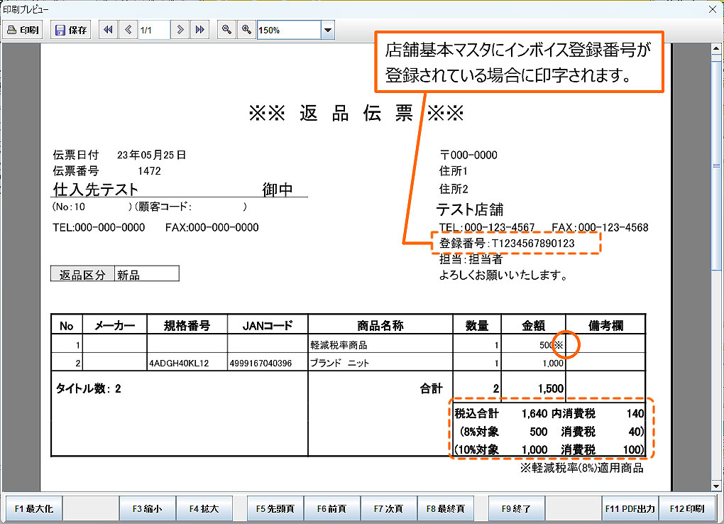 「店舗基本マスタ(基本2)」に「インボイス登録番号」が登録されている場合は「インボイス登録番号」が印字されます。