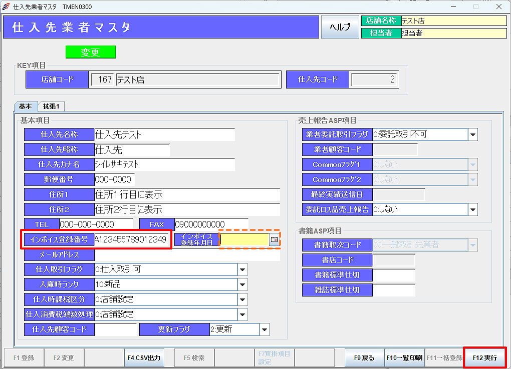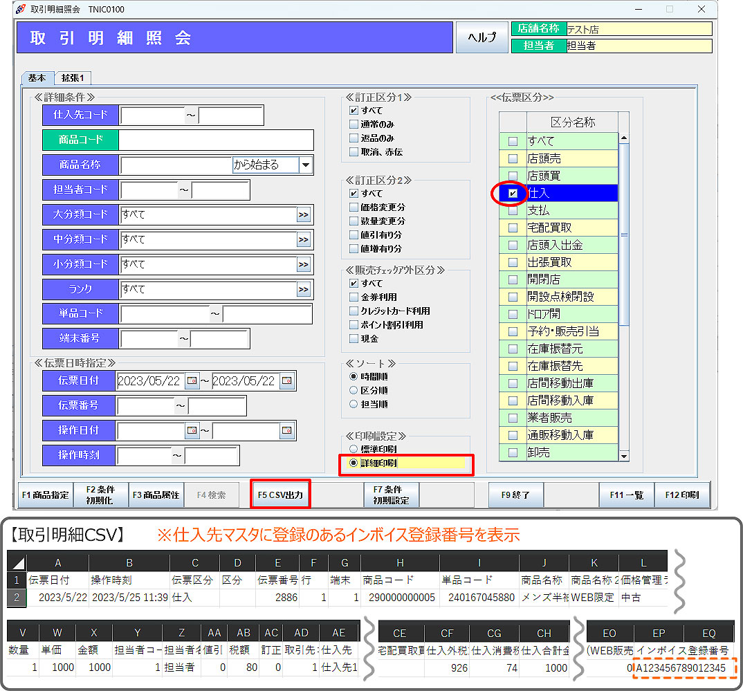 ※ 「店舗基本マスタ(基本2)>インボイス利用フラグ」が「1:利用する」の場合に、仕入先別実績表CSV出力項目の最終列に「インボイス登録番号」が表示されます。