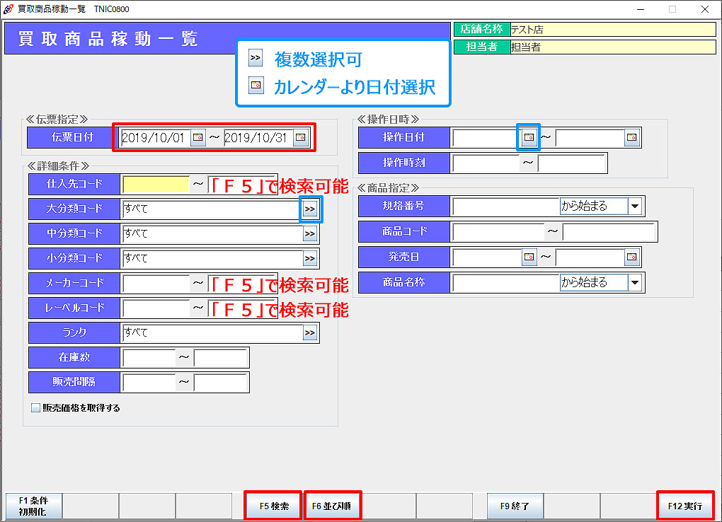 ※ 「F6並び順」より買取商品稼動一覧の並び順を指定できます。