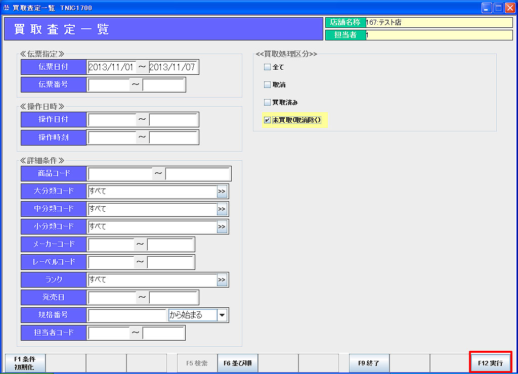 ① 伝票日付または操作日付、買取査定商品詳細、買取処理区分他抽出条件を入力します。