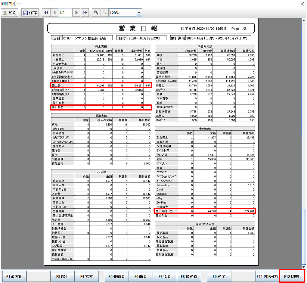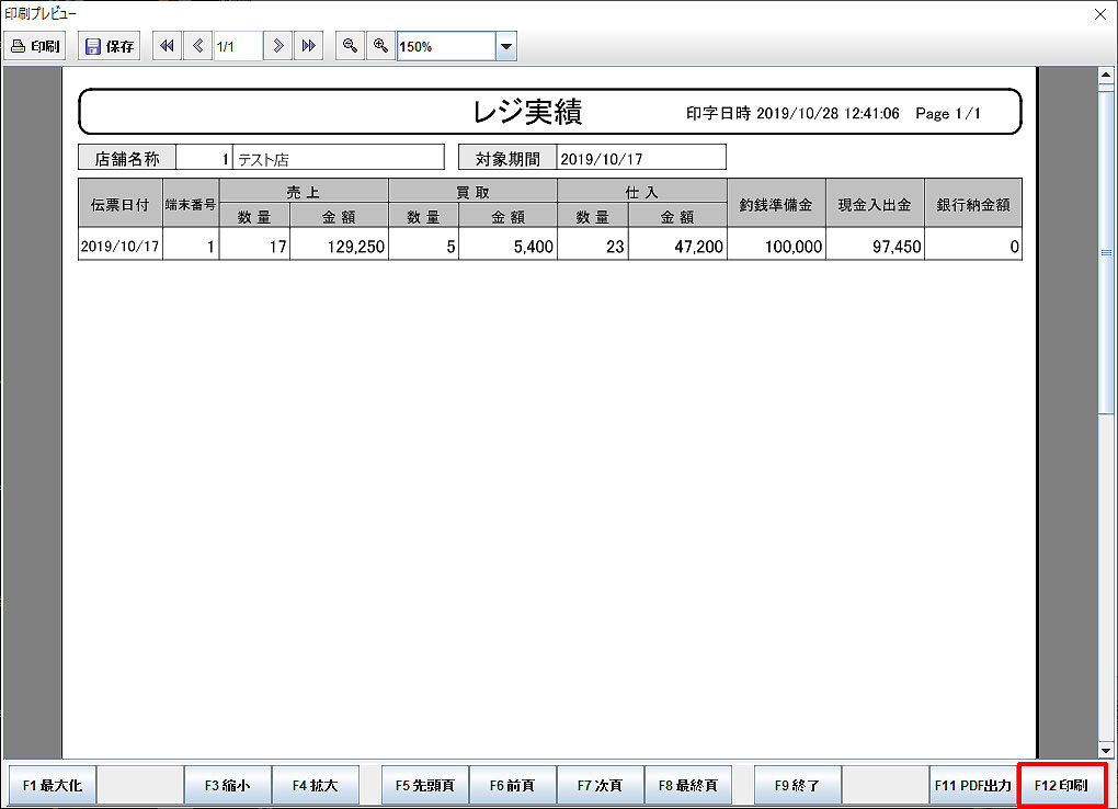 「F12印刷」でレジ実績を印刷します。
