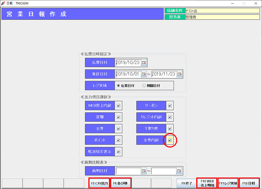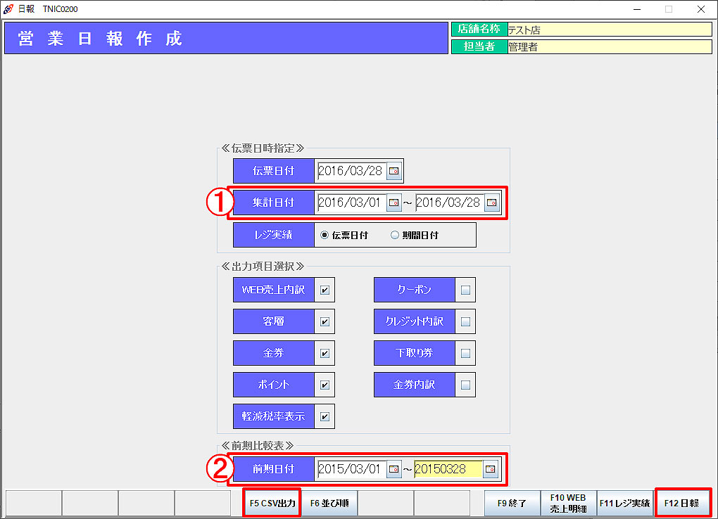 「F5CSV出力」:営業日報、レジ実績、WEB売上明細をCSVファイル出力します。