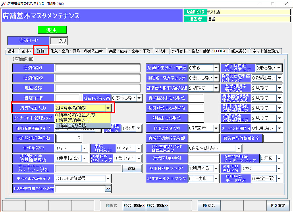 「店舗基本マスタ(詳細)の清算納金入力」を「2:精算金額繰越」に設定すると、端末開設時、一括入力欄に前日の精算時繰越金を反映させることができます。