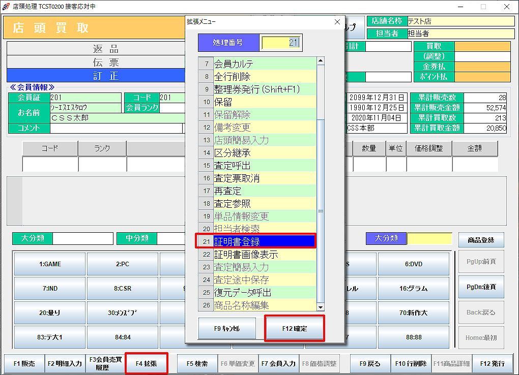 ① 拡張(F4)メニューから「証明書登録」を選択し「F12確定」をクリックします。
