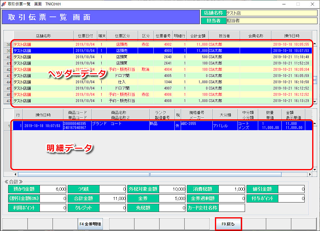※ 取引伝票の中に金券利用がある場合は「F4金券明細」より券種と利用額を見ることができます。