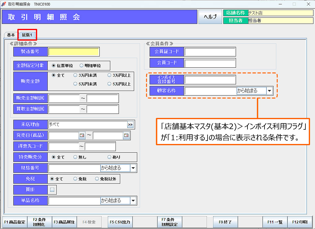 「店舗基本マスタ(基本2)>インボイス利用フラグ」が「1:利用する」の場合に、検索条件に「インボイス登録番号」、「顧客名称」入力欄が表示されます。 顧客情報の氏名やインボイス登録番号で検索して取引明細を抽出することができます。