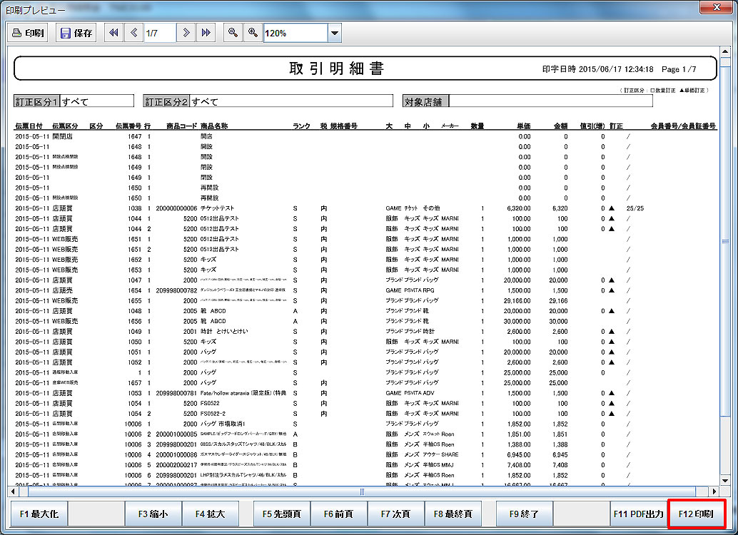「F5CSV出力」:取引明細をCSVファイルで保存します。