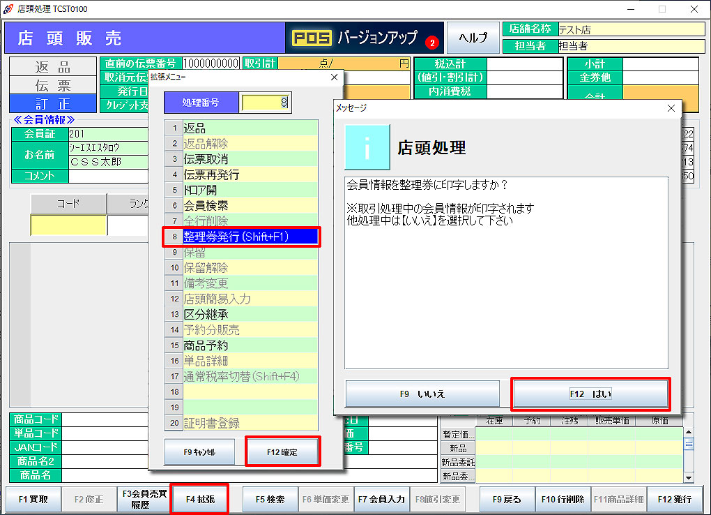 ※ 会員情報を呼び出した状態でこの動作を行うと、会員情報の印字有無を問うメッセージが表示されます。「F12はい」で受付票が発行されます。 (「発行後動作:会員クリア」「発行情報印字:印字する」の場合を除く)