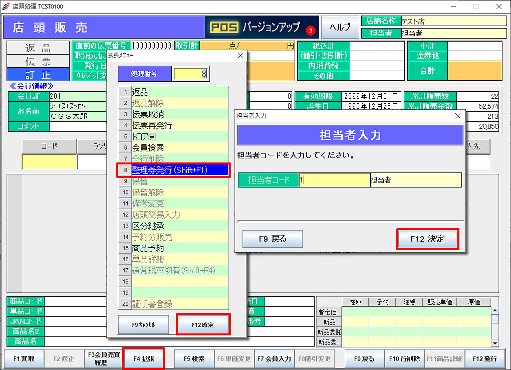 店頭処理画面で「Shift+F1」もしくは「F4拡張>整理券発行」を実行すると、【担当者入力】画面が表示されます。
