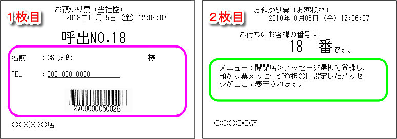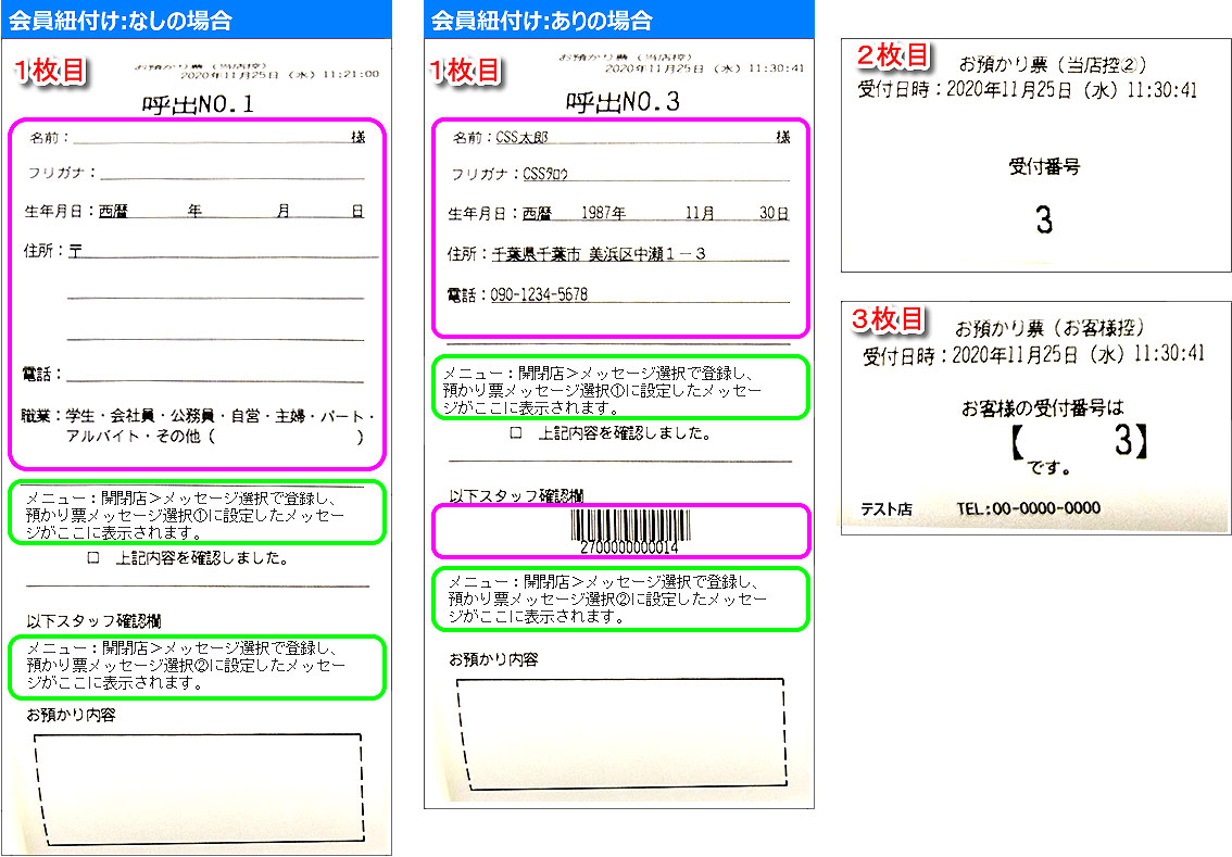 ※ 受付票2枚目(お店控)、受付票3枚目(お客様控)は会員紐付けの有無にかかわらず共通です。 - 受付票レシートの文言は固定です。メッセージの追加・編集は行えません。