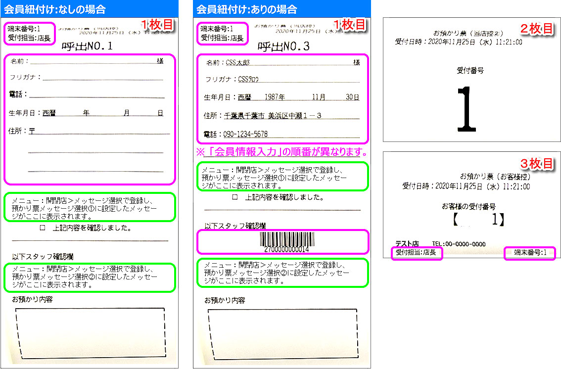 - 受付票1枚目(お店控)のレイアウトは会員紐付けの有無により会員情報入力の順番が異なります。