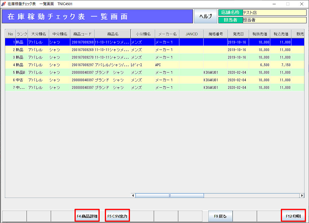 「F12印刷」で在庫稼働チェック表を印刷します。
