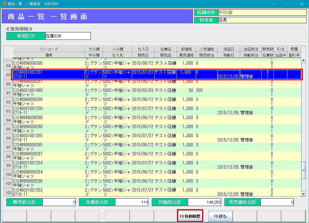 2.条件に当てはまる商品一覧が表示されます。 商品を選択して「F8移動履歴」から対象商品の入出庫状況を見ることができます。