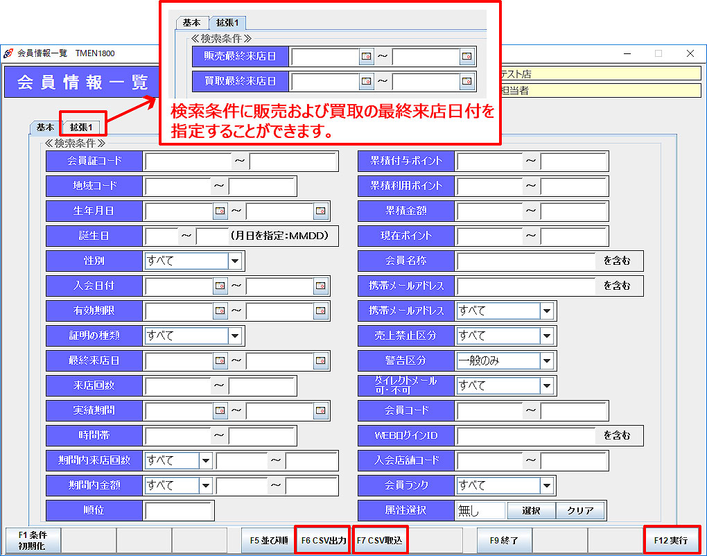 「F1 会員リストCSV」:出力した会員情報を「F7 CSV取込」で取り込み、画面に表示します。