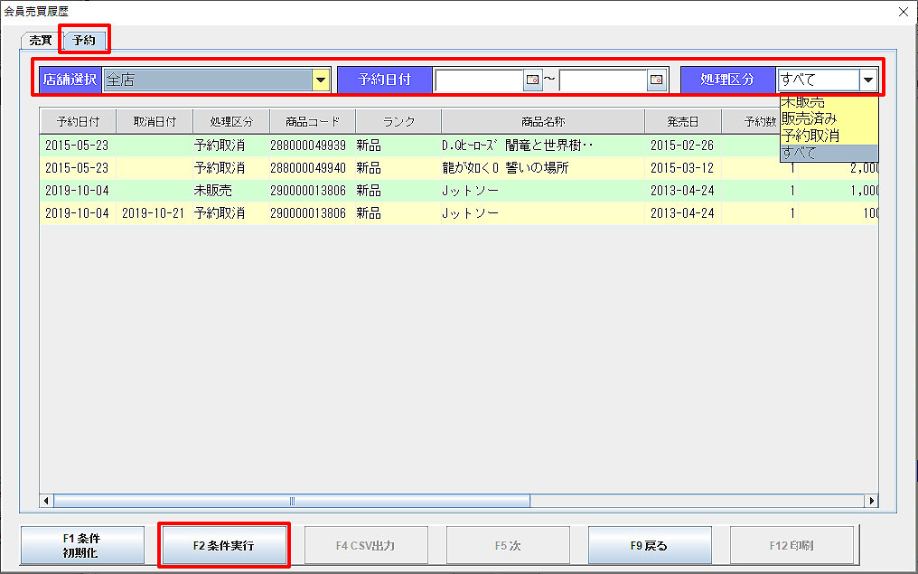 予約日付・処理区分を「予約中(未販売)」「販売済」「予約取消」から指定して「F2条件実行」をクリックすると、条件を絞って予約情報を抽出することができます。