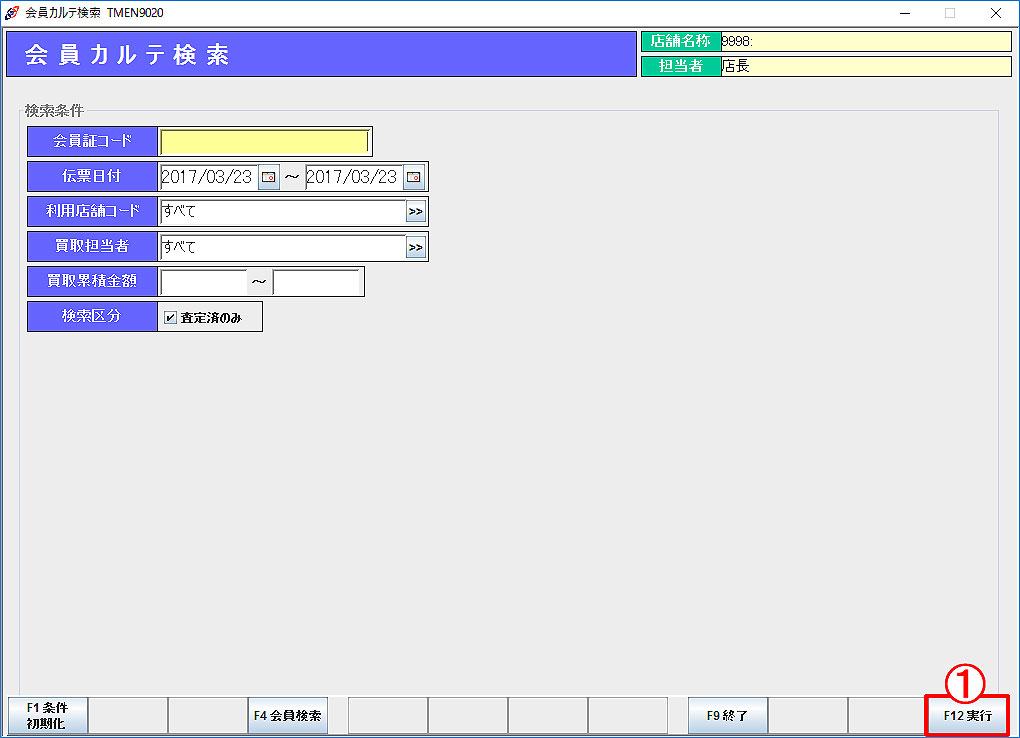 ① 「取引伝票日付」他検索条件を入力し、「F12実行」をクリックします。