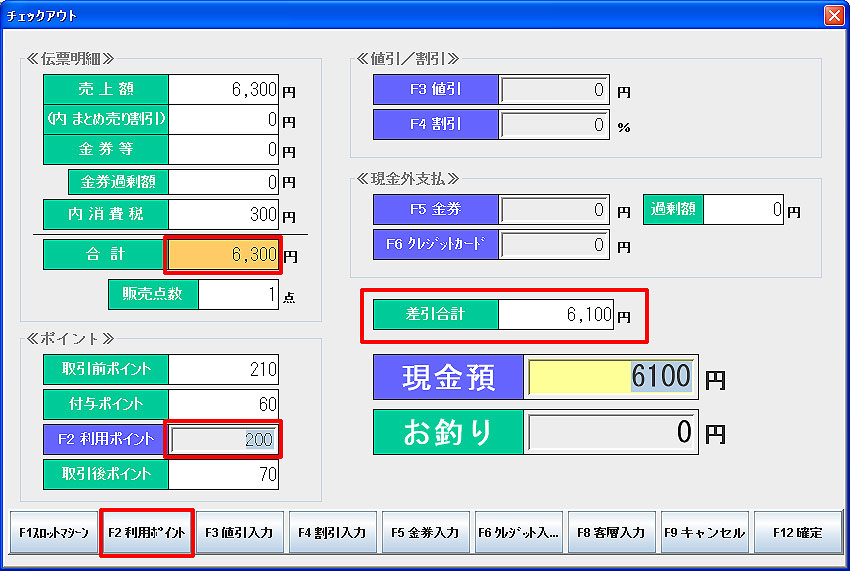 チェックアウト画面で「F2利用ポイント」をクリックし、利用するポイント数を入力します。