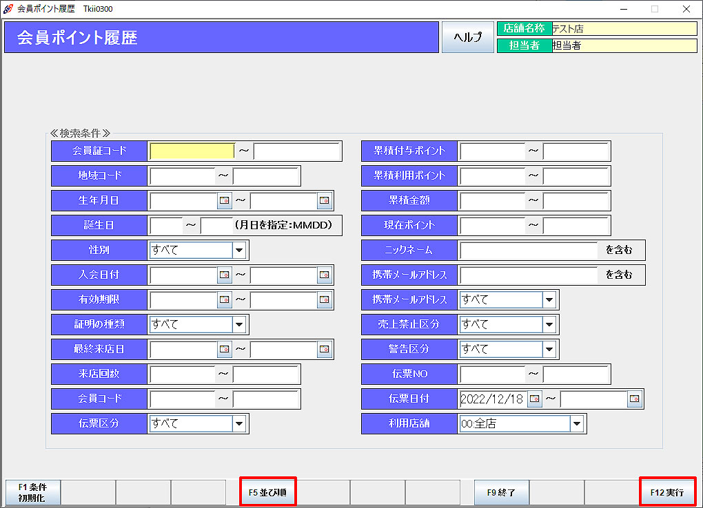 「F12印刷」:会員ポイント履歴を印刷します。