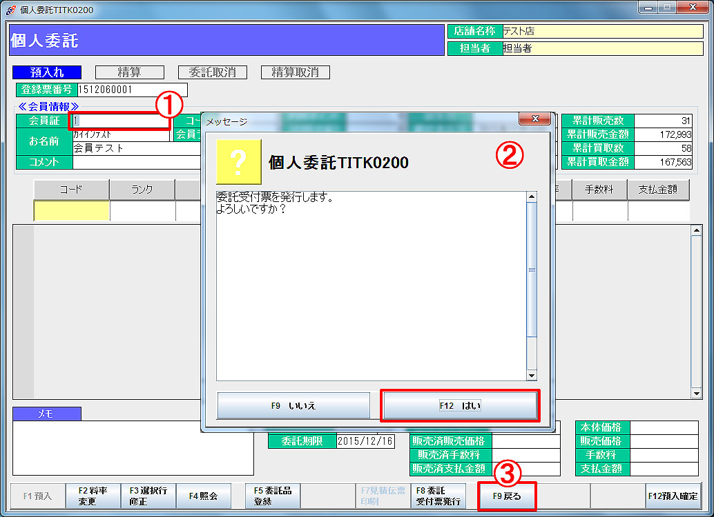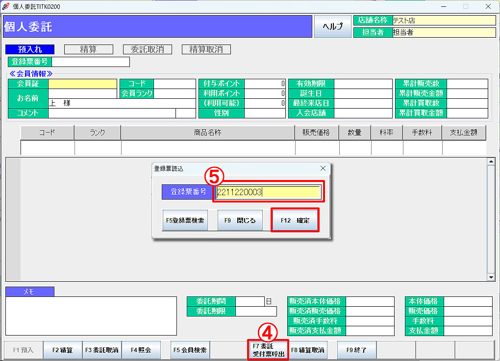委託品登録の際には「F7委託受付票呼出」から委託受付票のバーコードを読み、会員情報を呼び出します。