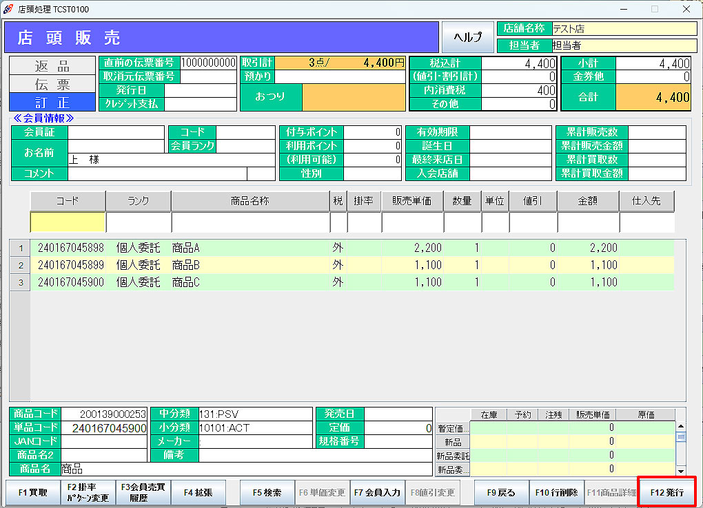 「F11一括明細印刷」:個人委託品一覧を印刷します。