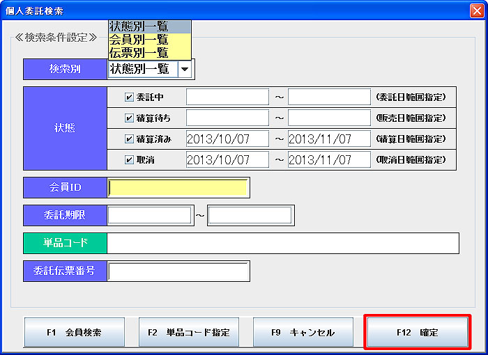 「F8一括明細CSV出力」:個人委託品一覧をCSVファイル出力します。