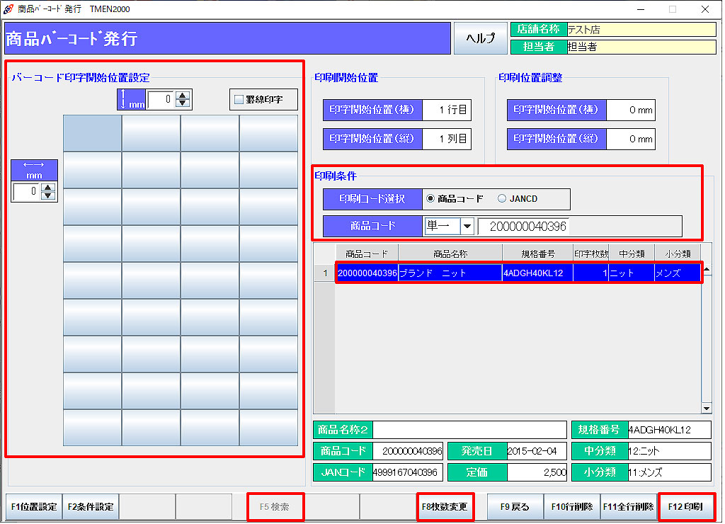 印字枚数の変更は、商品行を選択(青色に反転)して「F8枚数変更」で行います。