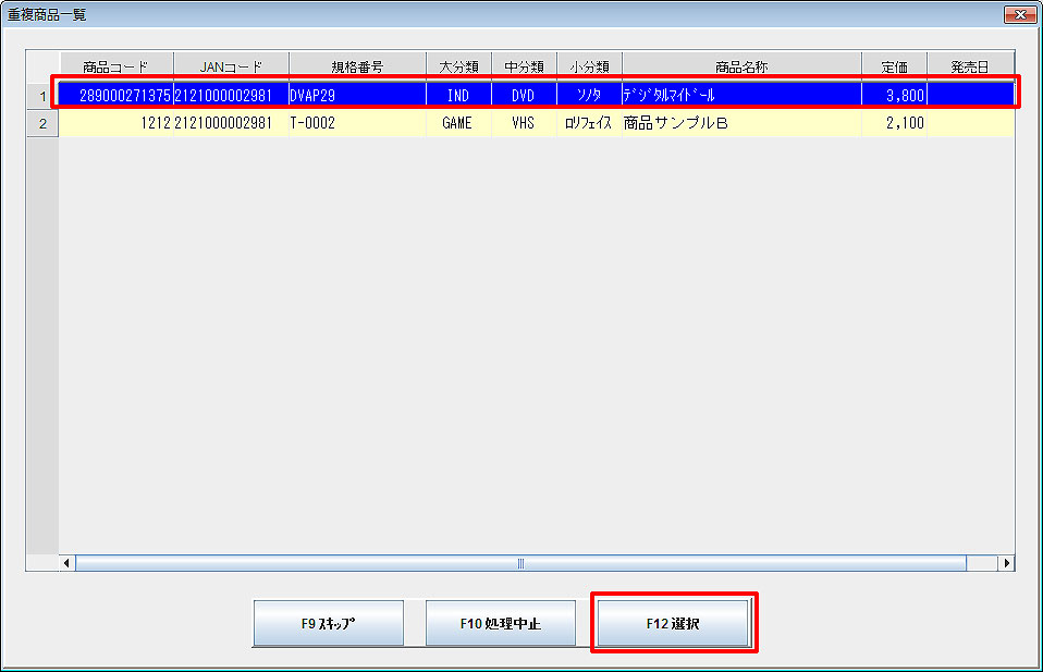 「F10処理中止」で商品データの取込を中止し、商品データ一覧画面(「F12取込確定」前の状態)に戻ります。