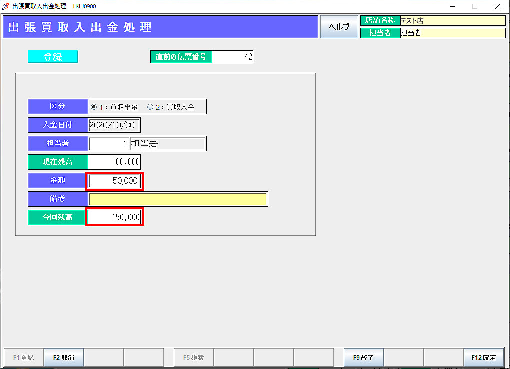※ 入金の取り消しは「F2取消」より行えます。(下記「買取入出金を取り消すには」参照)